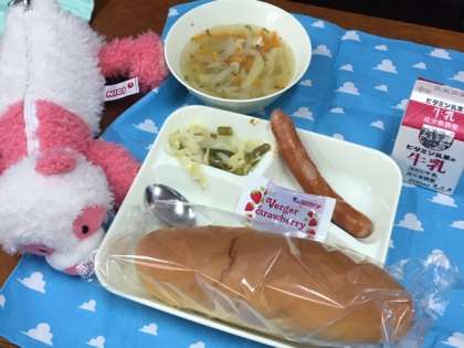 今日の給食献立は、コッペパン・ウインナーのケチャップソース・キャベツとさんどまめのサラダ・鶏肉と野菜のスープ・いちごジャム・牛乳です。