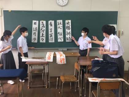 書道部は、教室で自分たちの作品の相互鑑賞をしています。1年生も練習次第で、来年の書き初めではこれくらいに書けるようになるでしょうね。