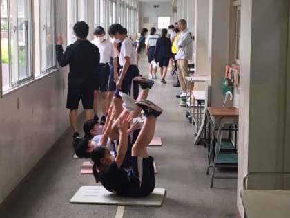 陸上部は廊下で筋トレです。部員数が多いけど廊下でも整然とした練習はさすがです。