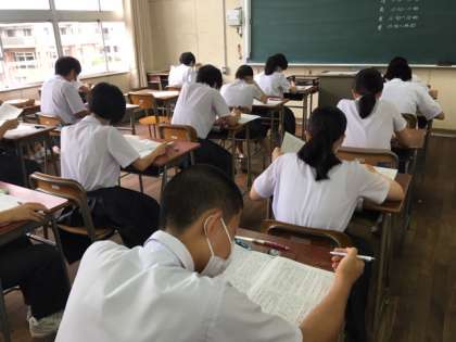 今日は、3年生の第1回実力テストです。国語・社会・数学・理科・英語、各50分。