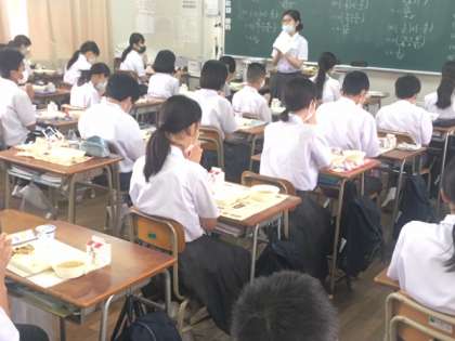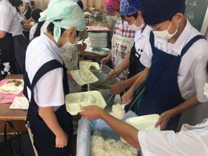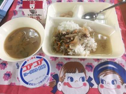 今日の給食献立は、牛丼・とうがんのみそ汁・大福豆の煮もの・ヨーグルト・牛乳です。