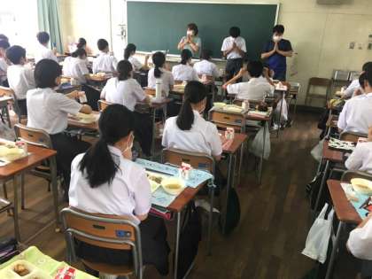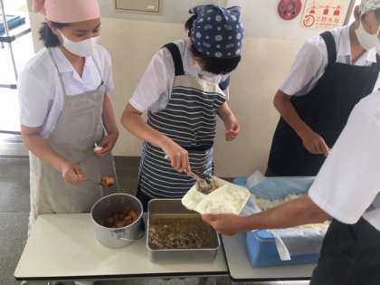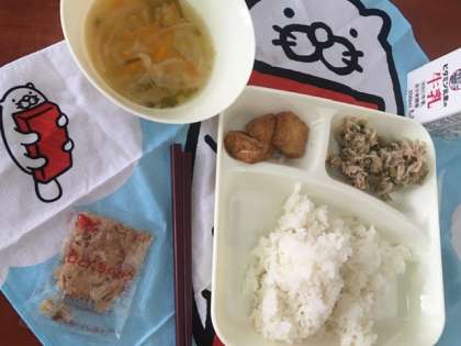 今日の給食献立は、ごはん・ゴーヤチャンプルー・厚揚げのしょうが醤油かけ・すまし汁・牛乳です。