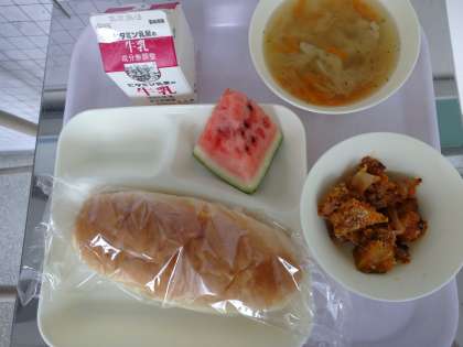 今日の給食献立は、おさつパン・かぼちゃのミートグラタン・スープ・すいか・牛乳です。