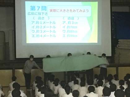 2年生の平和学習では、日本に投下された原子爆弾について、模造紙で作った型紙で実物の大きさを感じていました。