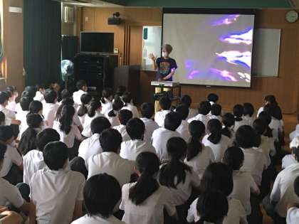今日の6時間め、1年生は各クラスで道徳の授業、2年生は体育館で平和学習、3年生は多目的室で性教育の学習をしていました。