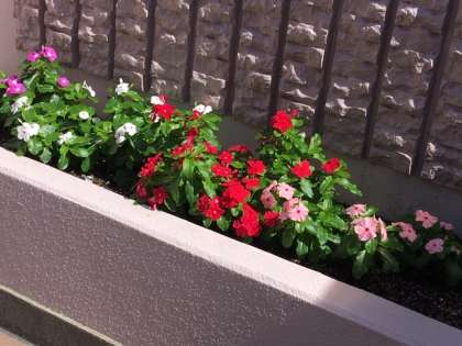 玄関の花も輝いて見えます。グラウンドからは「早よ使て〜」という声が聞こえてくるようです。