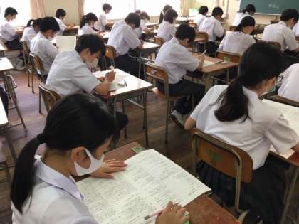今日と明日は期末テストです。臨時休業明けからまだひと月余り。1年生にとっては中学校に入学して初めてのテストです。今日は、英語・国語・音楽・プラス3年生だけ技術家庭科。明日は、数学・理科・社会です。どの学年も、みんな真剣に取り組んでいます。