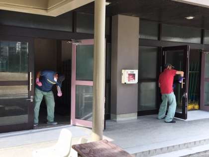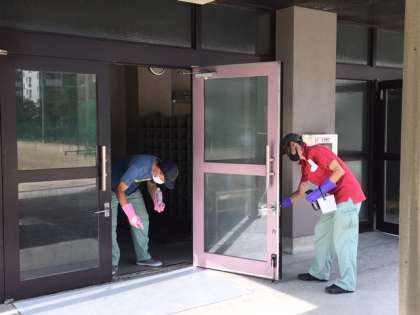 写真は、始業前に体育館の共有部分を管理作業員さんが消毒してくれている様子です。