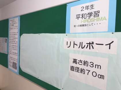 2年生では、7月に平和学習に取り組みました。75年前、広島に投下された原子爆弾リトルボーイの実物大の模造紙や、戦争の経緯、被爆者の証言など含んだ映画を観たりして学習しました。