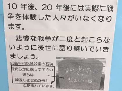 「この学習を経て、原子爆弾の恐ろしさ、戦争の悲惨さ、平和の尊さを改めて理解できた。・・・このようなことが二度と起こらないように、後の人に伝えていかなければならないと思った。」