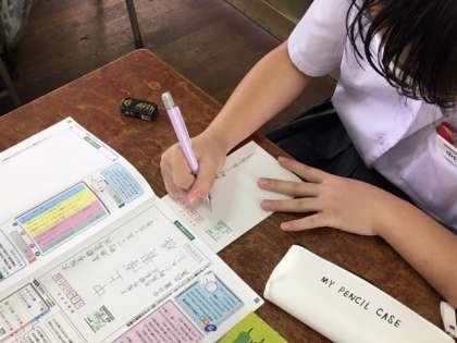 宛名の書き方や裏の文章の書き方など、葉書のイロハを学習しています。実際の葉書に、鉛筆で下書きをしてから、丁寧に書きます。