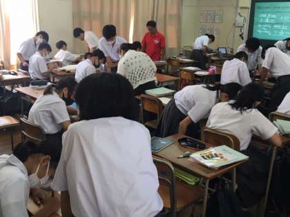 ひと通りの学習をした後、理解できている生徒が、わかりにくくなっている生徒に教えてあげています。固定のペアとかではなくて、クラス内で、わからない人にわかっている人が教える時間です。