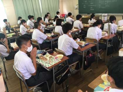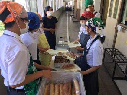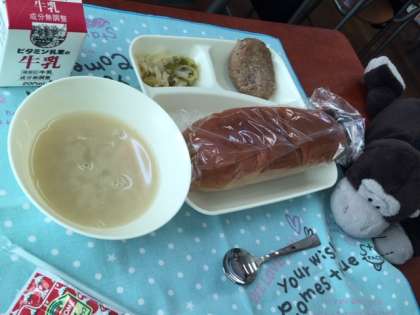 今日の給食献立は、黒糖パン・焼きハンバーグ・キャベツとピーマンのソテー・豆乳スープ・牛乳です。
