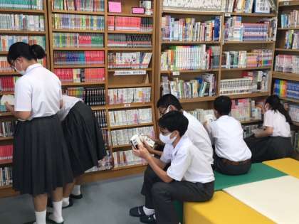 毎日の朝読書で読む本は、結構、家から持ってきている生徒も多いようです。給食準備の待ち時間に本を読んでいる生徒に見せてもらうと、図書館だけでなく、家から持ってきている場合も多く、どんどん読みたい気持ちはよくわかります。
