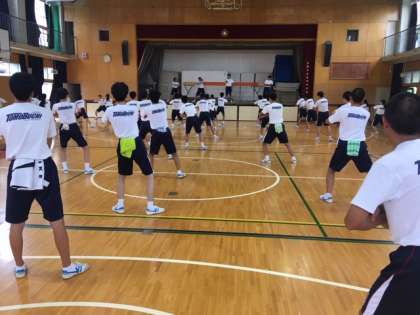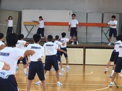 体育委員が壇上でリードしながら、少しずつ覚えていきます。まだまだ、部分練習の段階で、同じところを何度も何度もして、身体で覚えていきます。
