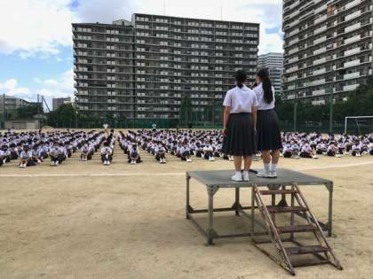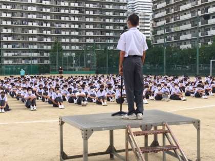 昨日は雨でグラウンドが使えなかったので、今日、全校集会を行いました。
