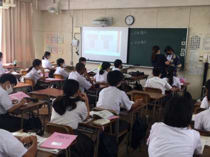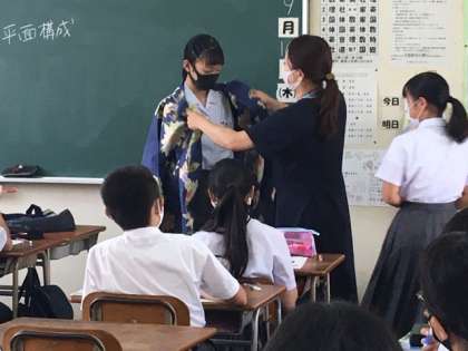 1年生の家庭科の授業です。衣服の項目の授業をしています。今日は、和服を実際に着てみて、その長所や特徴についても学習しました。