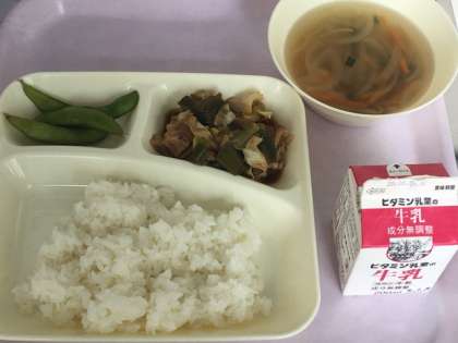 今日の給食献立は、ごはん・ホイコーロー・中華スープ・枝豆・牛乳です。