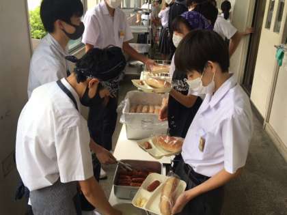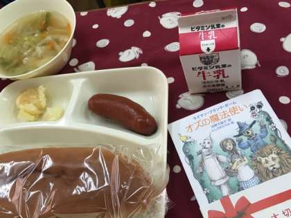 今日の給食献立は、黒糖パン・フランクフルトのケチャップソース・焼きじゃが・野菜スープ・牛乳です。