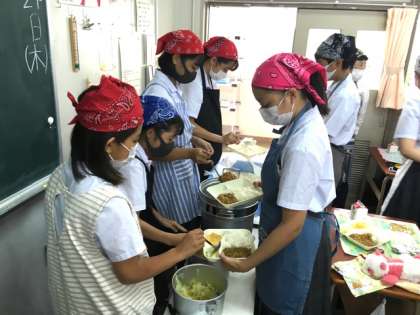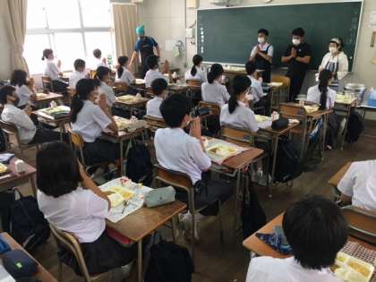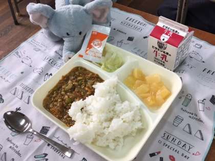 今日の給食献立は、キーマカレーライス・キャベツとコーンのサラダ・白桃(缶詰め)・牛乳です。