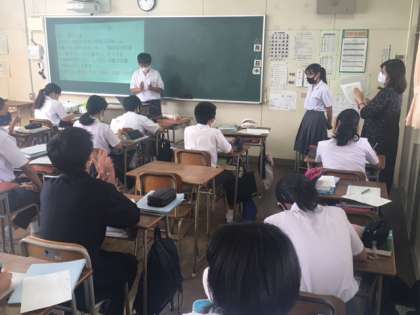 1年生の英語の授業です。今日はC-NET(ネイティブイングリッシュの先生)が来られている日で、一人ずつ英語で自己紹介をしています。クラスのみんなの前ですが、しっかりと英語で話せています。