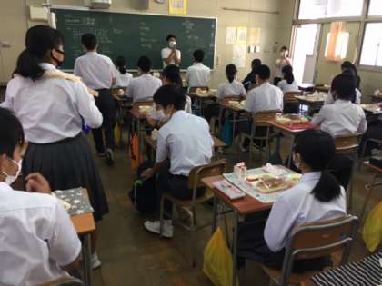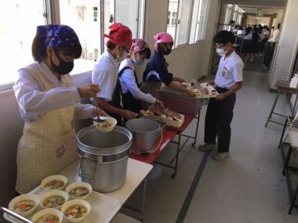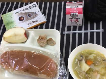 今日の給食献立は、黒糖パン・鶏肉のガーリック焼き・豚肉と野菜のスープ煮・りんご・牛乳です。