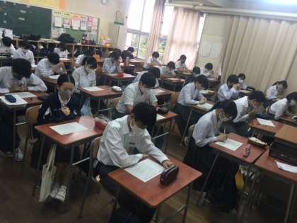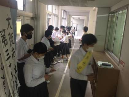 例年であれば、体育館で全校生徒が集まってやる行事ですが、コロナ禍の中700人が体育館に集まることができないので、グラウンドも雨でできず、放送で行うこととなりました。