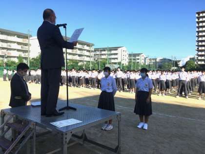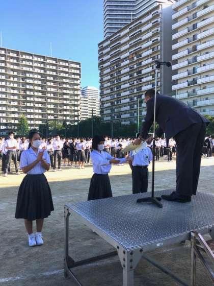 今日の表彰伝達は、陸上部の大阪府大会で、3年生女子円盤投げで第2位、3年生女子砲丸投げで第3位の成績を収めました。