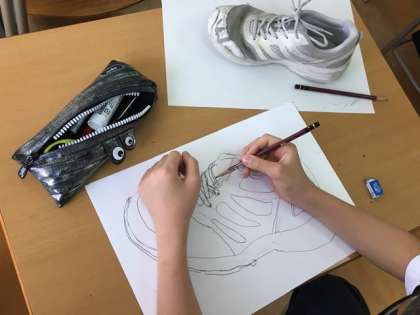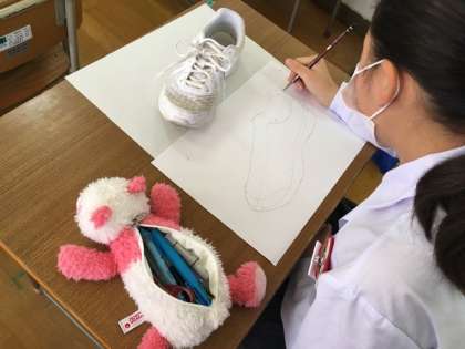 1年生の美術の授業です。自分の靴のデッサンをしています。