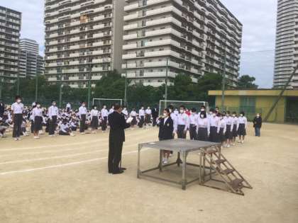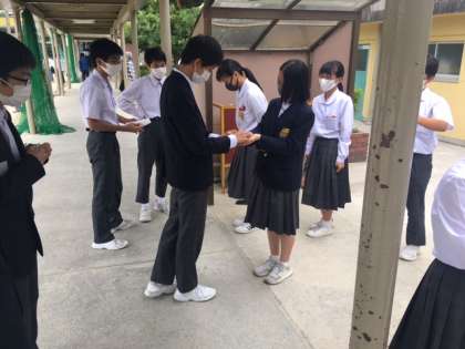 認証式すべてが終わって校舎に戻る際に、前期生徒会役員が後期の役員に委員バッチを引き継いでいました。