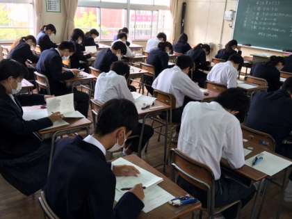 見た様子はいつも通りのテスト風景ですが、テスト問題を読む真剣な眼差しと緊張感のある空気から、生徒の皆さんの思いを感じさせられます。