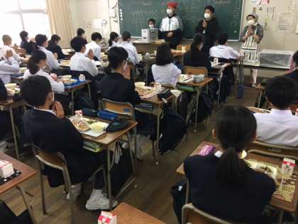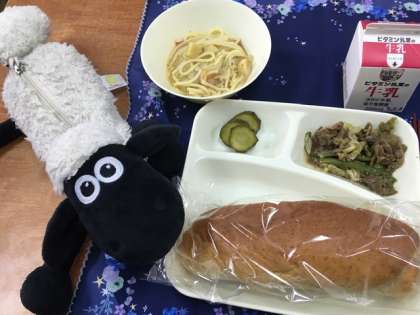 今日の給食献立は、ライ麦パン・牛肉のカレー風味焼き・ほたて貝とトマトのスープスパゲッティ・きゅうりのサラダ・牛乳です。