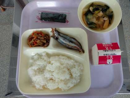 ごはん・焼きししゃも・五目汁・きんぴらごぼう・焼きのり・牛乳です。