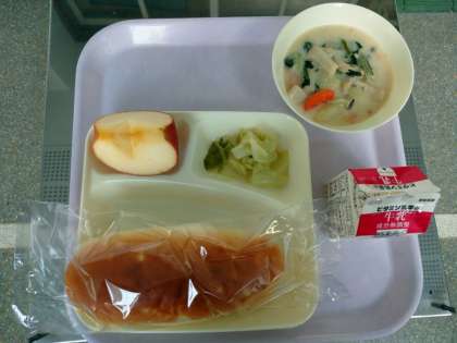 おさつパン・きのこのクリームシチュー・キャベツのピクルス・りんご・牛乳
