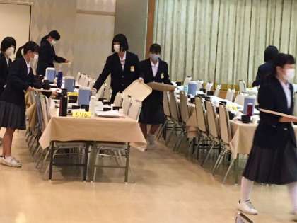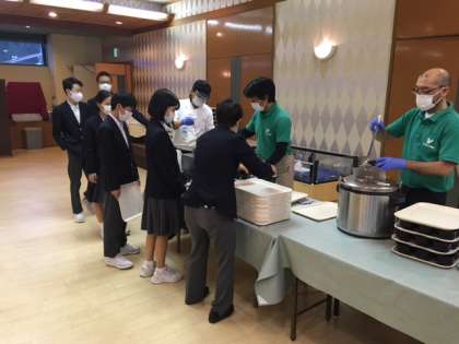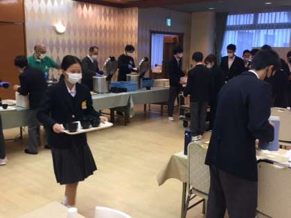 食事係の生徒たちが、ホテルの方々から朝食を受け取って準備をしています。
