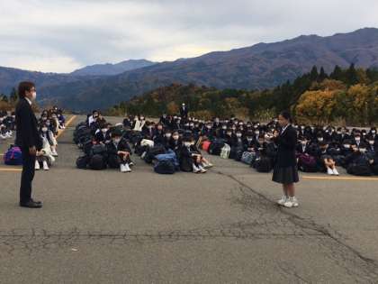 ホテル前で退館式を行いました。修学旅行実行委員からお礼のことばの後、ホテル支配人さんのお言葉をいただきました。