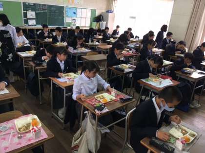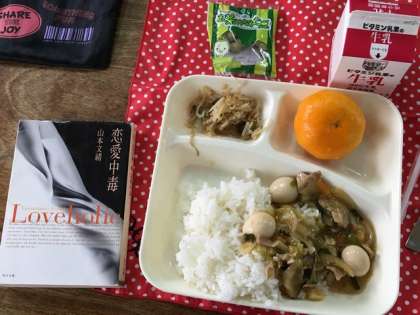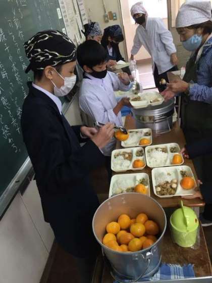 今日の給食献立は、中華丼・もやしと三度豆の中華あえ・抹茶大豆・みかんです。