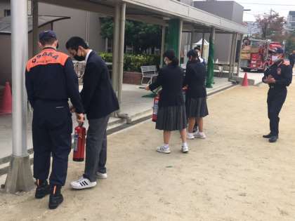 都島消防署から消防士さんにお越しいただいて、水消火器を使っての訓練と講話をしていただきました。