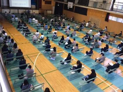 午前中、3年生保護者進路説明会を行いました。感染防止対策として体育館の窓を全開していますので、寒い中ですが、多くの保護者の皆さまにお越しいただきました。