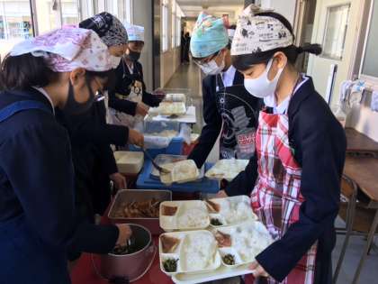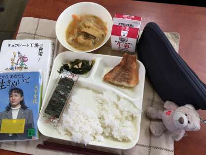 今日の給食献立は、ごはん・赤魚の醤油だれかけ・味噌汁・小松菜の炒め物・焼き海苔・牛乳です。
