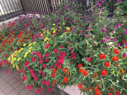 夏に植えた正門横の花々が、長い期間、咲いています。