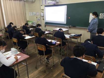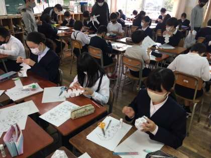 数学科講座では、画用紙で正多面体を作ります。正三角形、正五角形などからなきる立体から、その特徴を調べます。