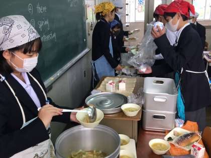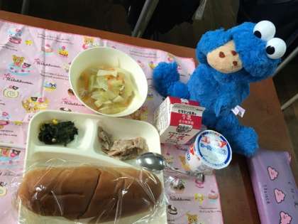 今日の給食献立は、黒糖パン・豚肉のガーリック焼き・ほうれん草のソテー・野菜スープ・ヨーグルト・牛乳です。