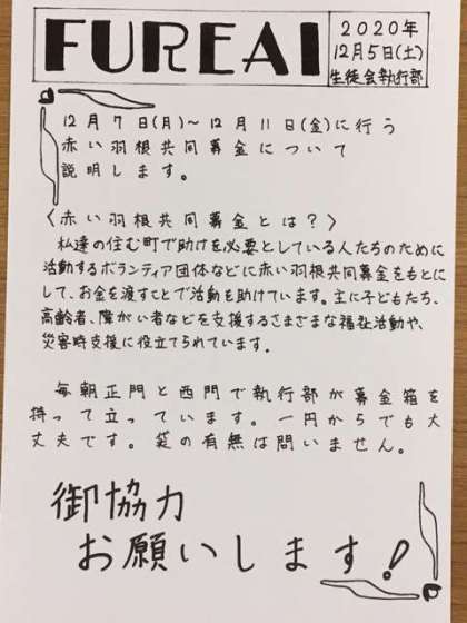 今日発行の生徒会新聞「FREAI」です。来週一週間、募金活動を行うので、今回の募金目的をお知らせしてくれています。