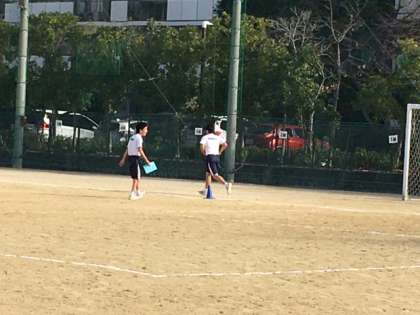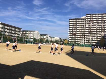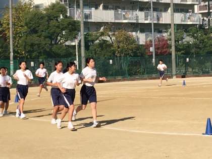 3年生の体育の授業では、現在、長距離走に取り組んでいます。今日は、男子1,500M、女子2,000Mに取り組んでいました。男女とも完走を目標にして走ります。男子では速い生徒で5分台前半のタイムでゴールします。