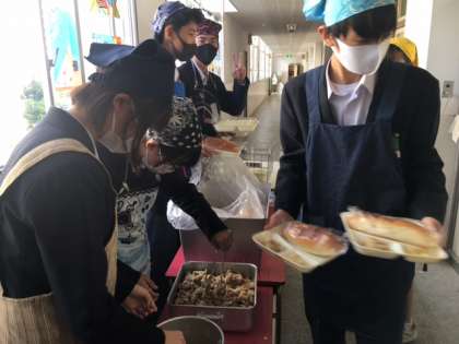 今日の給食献立は、おさつパン・鶏肉の唐揚げ・中華味噌スープ・もやしとコーンの甘酢和え・牛乳です。