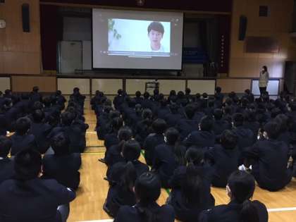 友渕中学校では、今週の各学年集会で、文部科学省監修のビデオを観て、みんなで考えることにしています。渡辺徹さんと榊原郁恵さんの息子さんが出演している3分ほどの映像です。