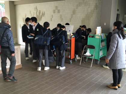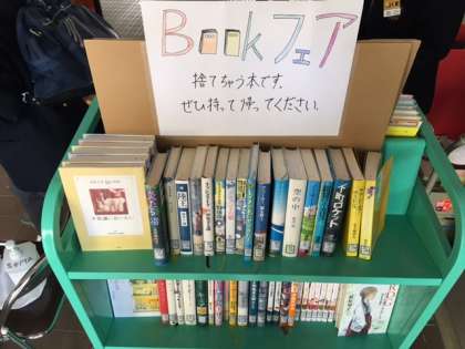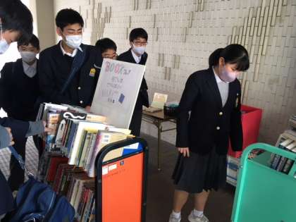 友渕中学校図書館での役目を終えた本を、生徒の皆さんに提供します。冊数制限なしで無料です。昼の12時30分〜13時30分の時間帯に玄関ピロティで行っています。本校の図書ボランティアの方々が担当してくれています。