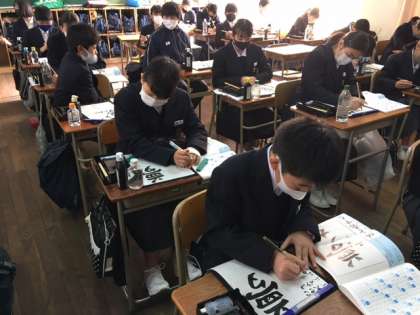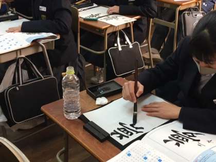 1年生の国語の授業、書写の時間です。書き初めで「夢を信じる」という文字を書きます。