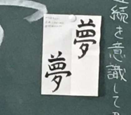 ほとんどの生徒が、「夢」という字を初めて墨で書くので、お手本を見ながらでもなかなか上手くいきません。1回めの反省点を書き出してから、2回めを書きました。明らかに上手くなっていますね。